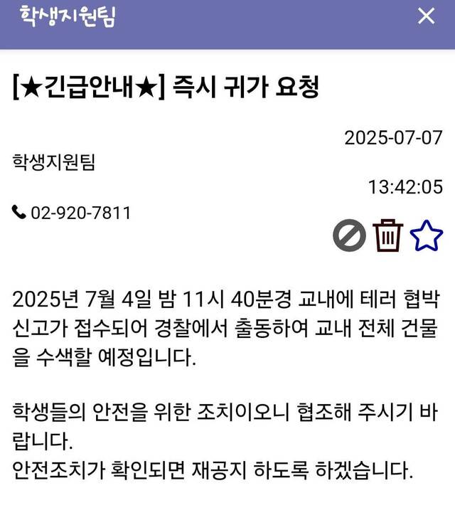 7월 7일 낮 12시25분, 학교 측의 신고를 접수한 서울성북경찰서는 즉시 출동했습니다. 현장에는 경찰특공대 190명, 폭발물 탐지견, 소방대원, 구급 인력까지 투입돼 성신여대 돈암수정캠퍼스와 미아운정그린캠퍼스 전역을 긴급 수색했습니다.